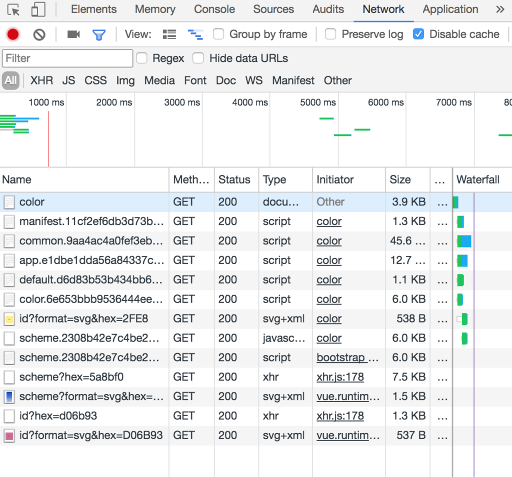 Chrome DevToolsのNetworkタブを使って、画面上のリンクで遷移した場合のリクエストを見てみても、初回表示以外はxhrリクエストになっていることがわかる。
