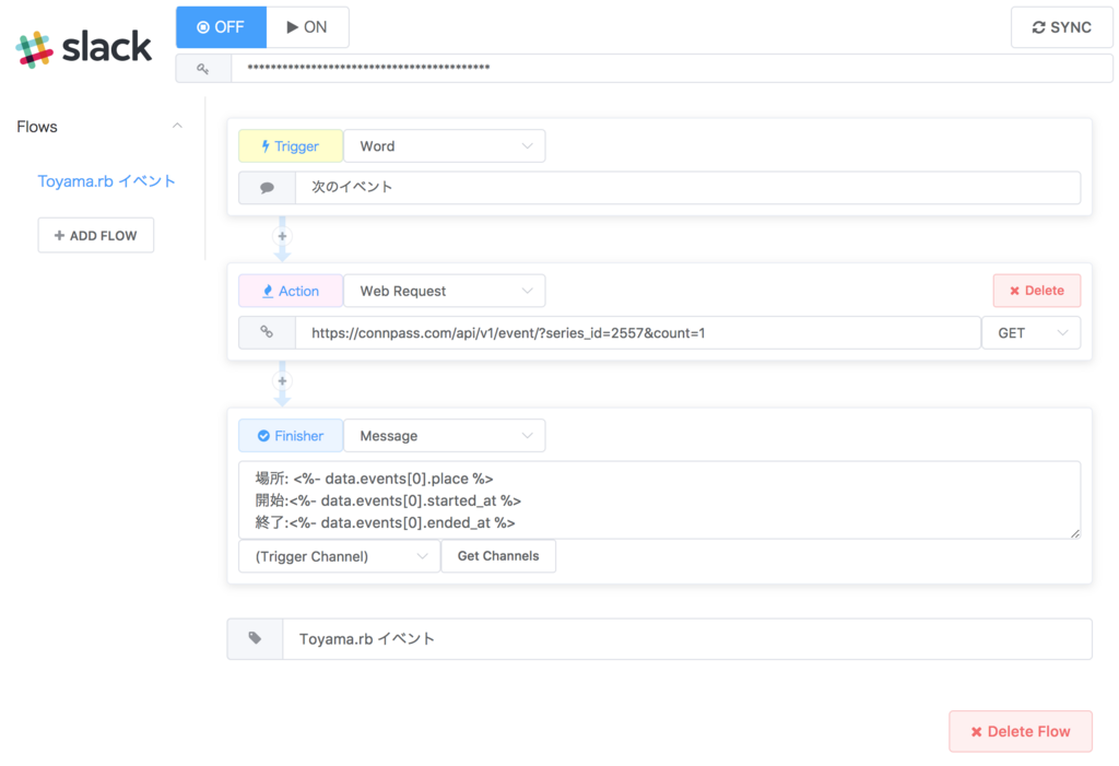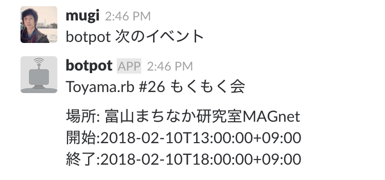 たとえば上に貼った画像の例ではToyama.rbのイベント情報をチャンネルに返してるが、これはActionで行ったaxiosのレスポンスが次のFinisherに渡されてるので可能になってる。